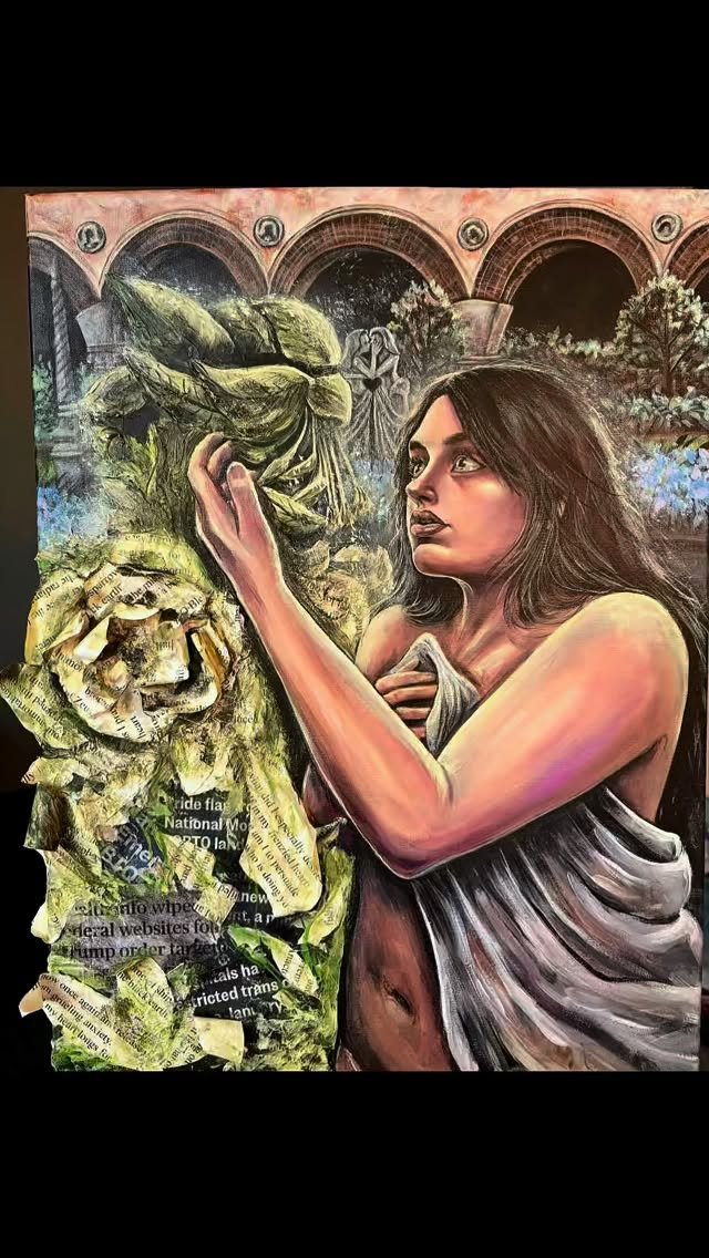 This painting and poem are about LGBTQ rights and my disdain for the patriarchy. The double Venus is a symbol for sapphics. This painting has anti-LGBTQ news articles underneath sculpted poems by Sappho. The painting and poem is meant to uplift sapphics and women. This was funded in part by South Carolina Arts Commission @scartscomm 🩷💜💙#art #savvyart #painting #poem #lgbtart